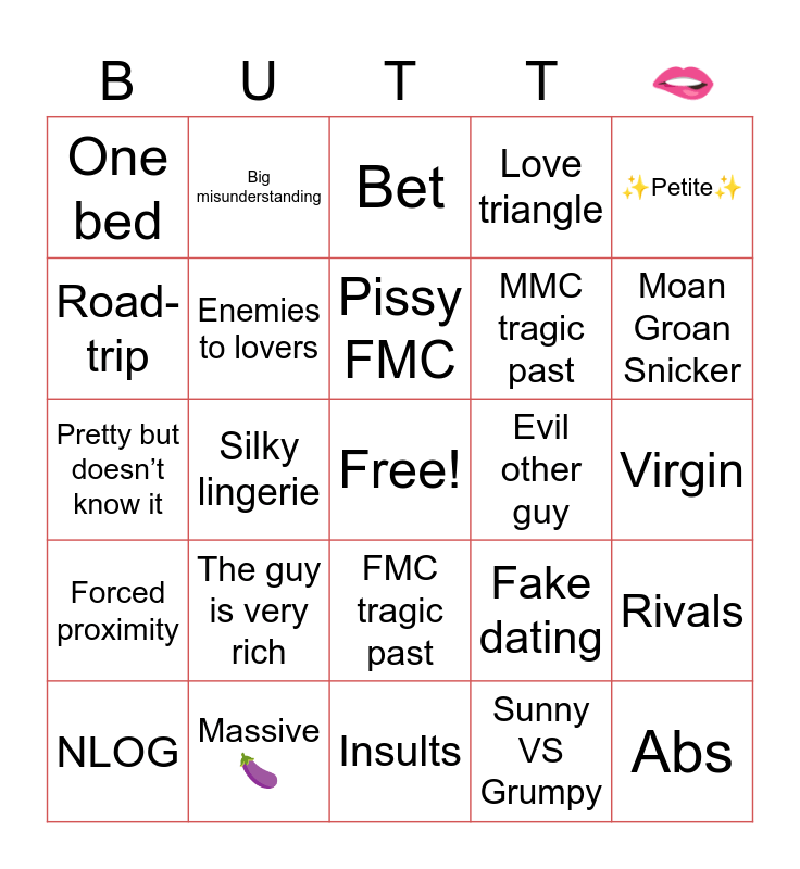 This bingo card has a free space and 24 words: The guy is very rich, Massive 🍆, Pissy FMC, NLOG, ✨Petite✨, One bed, Road-trip, Big misunderstanding, Evil other guy, FMC tragic past, MMC tragic past, Pretty but doesn’t know it, Fake dating, Rivals, Enemies to lovers, Sunny VS Grumpy, Virgin, Bet, Moan Groan Snicker, Silky lingerie, Abs, Forced proximity, Love triangle and Insults.