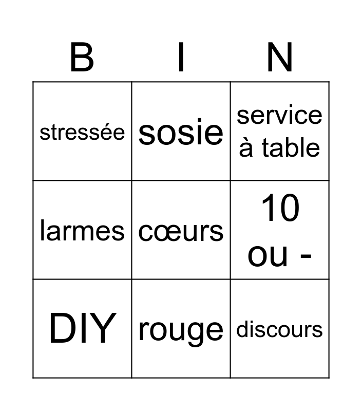 This bingo card has a free space and 8 words: 10 ou -, service à table, sosie, DIY, stressée, discours, larmes and rouge.