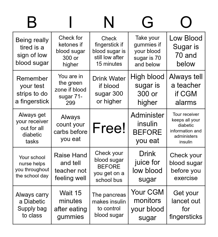 This bingo card has a free space and 24 words: Raise Hand and tell teacher not feeling well, Wait 15 minutes after eating gummies, Drink Water if blood sugar 300 or higher, Always carry a Diabetic Supply bag to class, Low Blood Sugar is 70 and below, Being really tired is a sign of low blood sugar, Remember your test strips to do a fingerstick, Check for ketones if blood sugar 300 or higher, Administer insulin BEFORE you eat, Check your blood sugar BEFORE you get on a school bus, High blood sugar is 300 or higher, Always get your receiver out for all diabetic tasks, Drink juice for low blood sugar, Check your blood sugar before you exercise, You are in the green zone if blood sugar 71-299, Your CGM monitors your blood sugar, Tour receiver keeps all your diabetic information and administers insulin, Check fingerstick if blood sugar is still low after 15 minutes, Always tell a teacher if CGM alarms, Always count your carbs before you eat, Get your lancet out for fingersticks, Your school nurse helps you throughout the school day, Take your gummies if your blood sugar is 70 and below and The pancreas makes insulin to control blood sugar.