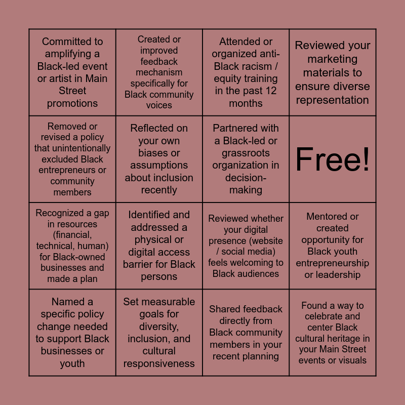 This bingo card has 17 words: Shared feedback directly from Black community members in your recent planning, Named a specific policy change needed to support Black businesses or youth, Attended or organized anti-Black racism / equity training in the past 12 months, Committed to amplifying a Black-led event or artist in Main Street promotions, Identified and addressed a physical or digital access barrier for Black persons, Reviewed your marketing materials to ensure diverse representation, Mentored or created opportunity for Black youth entrepreneurship or leadership, Partnered with a Black-led or grassroots organization in decision-making, Free!, Reflected on your own biases or assumptions about inclusion recently, Set measurable goals for diversity, inclusion, and cultural responsiveness, Reviewed whether your digital presence (website / social media) feels welcoming to Black audiences, Removed or revised a policy that unintentionally excluded Black entrepreneurs or community members, Created or improved feedback mechanism specifically for Black community voices, Recognized a gap in resources (financial, technical, human) for Black-owned businesses and made a plan, Committed publicly to one concrete action to improve cultural relevance and Found a way to celebrate and center Black cultural heritage in your Main Street events or visuals.
