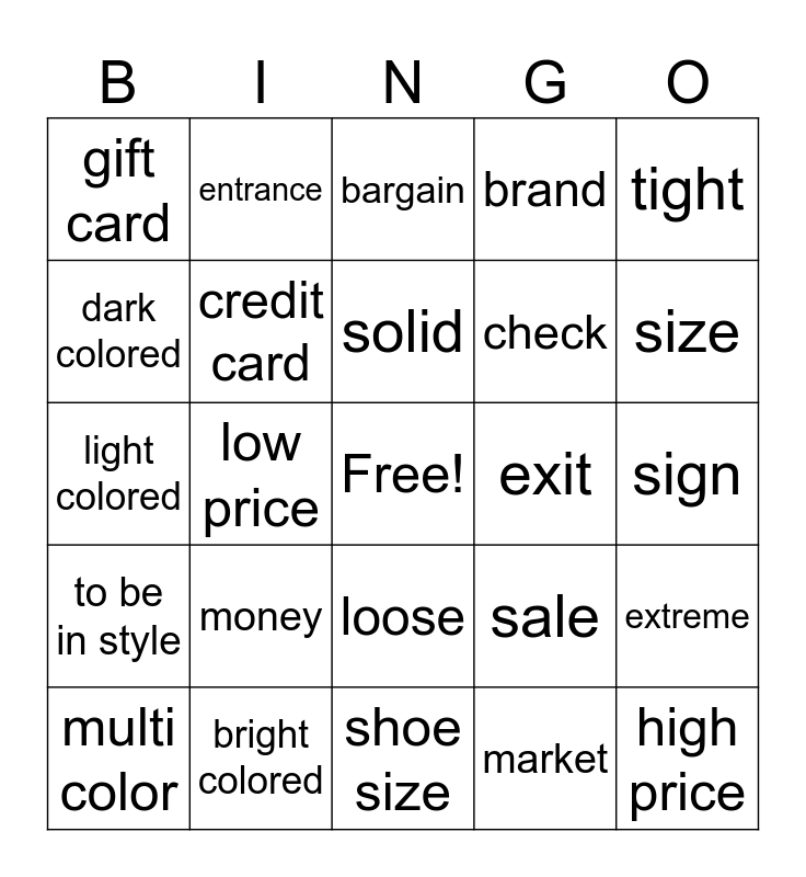 This bingo card has a free space and 24 words: money, bright colored, solid, multi color, tight, gift card, dark colored, entrance, exit, loose, check, light colored, sale, extreme, credit card, market, sign, bargain, size, low price, high price, to be in style, brand and shoe size.