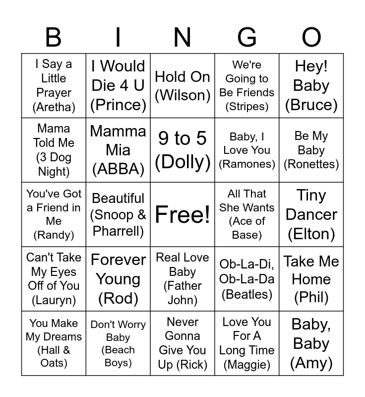 This bingo card has a free space and 33 words: Always By My Baby (Mariah), Baby, I Love Your Way (Big), Beautiful (Snoop & Pharrell), Over the Rainbow (Israel), Can't Take My Eyes Off of You (Lauryn), Mamma Mia (ABBA), Hey! Baby (Bruce), You Make My Dreams (Hall & Oats), I Would Die 4 U (Prince), Got To Give It Up (Marvin), 9 to 5 (Dolly), Hold On (Wilson), Jump (Pointer Sisters), Show Me Love (Robyn), All That She Wants (Ace of Base), Be My Baby (Ronettes), Don't Worry Baby (Beach Boys), You've Got a Friend in Me (Randy), Forever Young (Rod), Ob-La-Di, Ob-La-Da (Beatles), Real Love Baby (Father John), Sunday Best (Surfaces), I Say a Little Prayer (Aretha), Tiny Dancer (Elton), Never Gonna Give You Up (Rick), Baby, Baby (Amy), We're Going to Be Friends (Stripes), Baby, I Love You (Ramones), Mama Told Me (3 Dog Night), Take Me Home (Phil), What a Wonderful World (Louis), Love You For A Long Time (Maggie) and Forever and Ever, Amen (Randy).