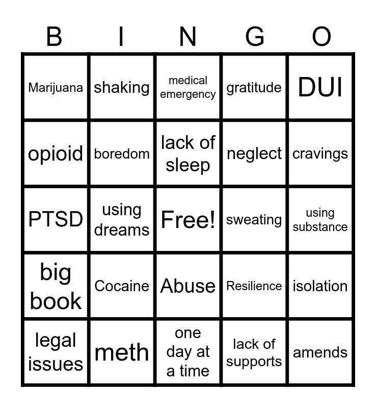 This bingo card has a free space and 24 words: Cocaine, meth, lack of sleep, legal issues, DUI, Marijuana, opioid, shaking, sweating, Abuse, neglect, PTSD, Resilience, isolation, boredom, lack of supports, using substance, medical emergency, cravings, using dreams, amends, big book, gratitude and one day at a time.