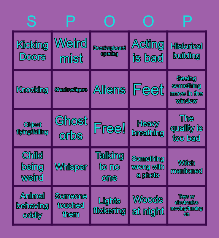 This bingo card has a free space and 29 words: Animal behaving oddly, a Shadow peeking at the door, Ghost orbs, Security Guard, Kicking Doors, Door/cupboard opening, Shadow/figure, Whisper, Heavy breathing, Someone touched them, The quality is too bad, Toys or electronics moving/turning on, Lights flickering, Woods at night, Seeing something move in the window, Security camera, Talking to no one, Child being weird, Historical building, Object flying/falling, Something wrong with a photo, Seeing something on the road, Feet, Knocking, Acting is bad, Weird mist, Witch mentioned, Aliens and Weird creature.
