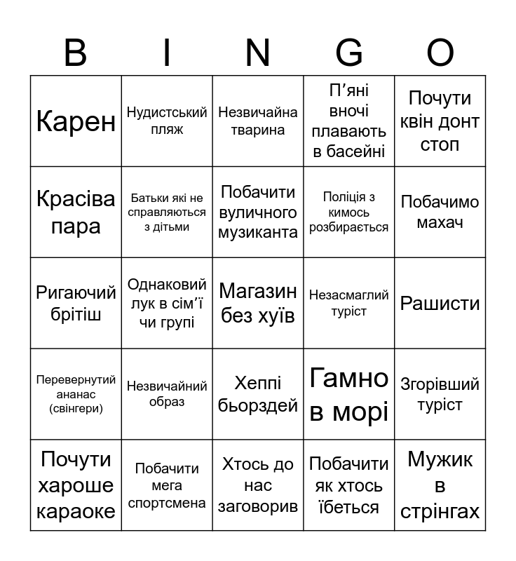 This bingo card has a free space and 24 words: Незвичайний образ, Побачити мега спортсмена, Побачити вуличного музиканта, Почути хароше караоке, Почути квін донт стоп, Карен, Красіва пара, Нудистський пляж, Незасмаглий туріст, Хеппі бьорздей, Поліція з кимось розбирається, Ригаючий брітіш, Гамно в морі, Згорівший туріст, Батьки які не справляються з дітьми, Побачити як хтось їбеться, Рашисти, Незвичайна тварина, Побачимо махач, Однаковий лук в сімʼї чи групі, Мужик в стрінгах, Перевернутий ананас (свінгери), Пʼяні вночі плавають в басейні and Хтось до нас заговорив.