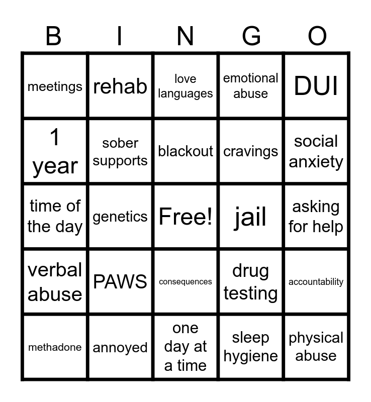 This bingo card has a free space and 24 words: PAWS, annoyed, blackout, methadone, DUI, meetings, 1 year, rehab, jail, consequences, cravings, time of the day, drug testing, accountability, sober supports, sleep hygiene, asking for help, love languages, social anxiety, genetics, physical abuse, verbal abuse, emotional abuse and one day at a time.