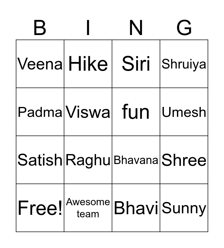 This bingo card has a free space and 15 words: Free!, Sunny, Siri, Veena, Umesh, Padma, Raghu, Bhavi, Viswa, Satish, Shree, Shruiya, fun, Hike and Awesome team.