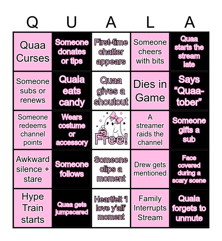 This bingo card has a free space and 24 words: Hype Train starts, Someone follows, Quaa gives a shoutout, Family Interrupts Stream, Quaa starts the stream late, Quaa Curses, Someone donates or tips, First-time chatter appears, A streamer raids the channel, Someone gifts a sub, Someone redeems channel points, Quala eats candy, Drew gets mentioned, Face covered during a scary scene, Someone subs or renews, Quaa gets jumpscared, Heartfelt ‘I love y’all’ moment, Someone cheers with bits, Says “Quaa-tober”, Awkward silence + stare, Wears costume or accessory, Someone clips a moment, Dies in Game and Quala forgets to unmute.