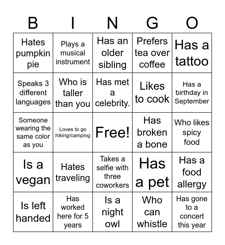 This bingo card has a free space and 24 words: Hates traveling, Has worked here for 5 years, Has met a celebrity., Is left handed, Has a tattoo, Hates pumpkin pie, Speaks 3 different languages, Plays a musical instrument, Has broken a bone, Takes a selfie with three coworkers, Likes to cook, Someone wearing the same color as you, Has a pet, Has a food allergy, Who is taller than you, Who can whistle, Who likes spicy food, Has an older sibling, Has a birthday in September, Loves to go hiking/camping, Has gone to a concert this year, Is a vegan, Prefers tea over coffee and Is a night owl.