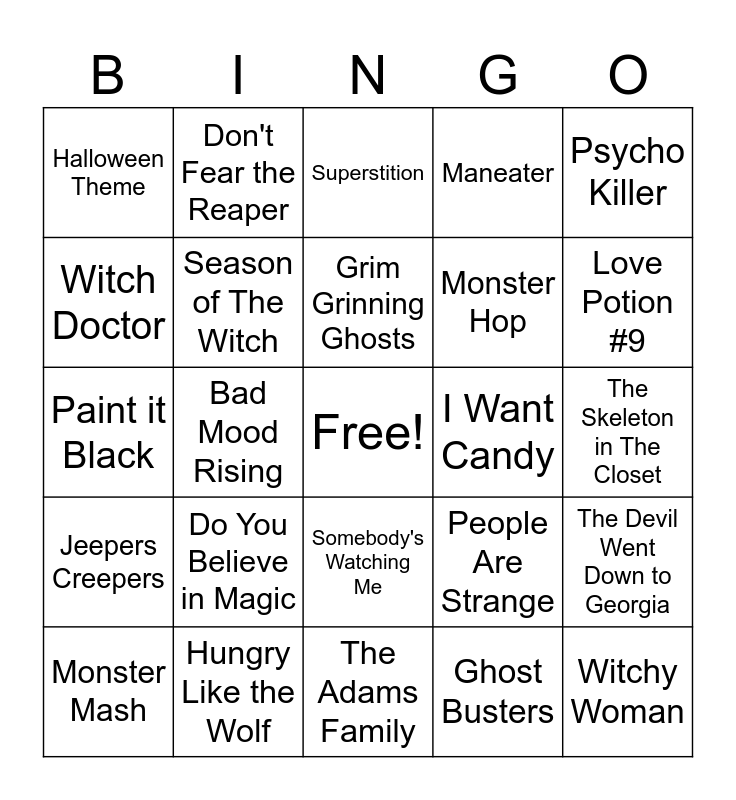 This bingo card has a free space and 43 words: Thriller, Witchy Woman, Purple People Eater, Monster Mash, This is Halloween, Ghost Busters, Superstition, Spooky Scary Skeletons, Psycho Killer, Hungry Like the Wolf, Maneater, I Want Candy, Somebody's Watching Me, Do You Believe in Magic, Witchcraft, The Adams Family, Devil in Disguise, Paint it Black, Black Magic Woman, Love Potion #9, Don't Fear the Reaper, Phantom of The Opera, Werewolves in Disguise, Halloween Theme, Twilight Zone, The Skeleton in The Closet, Ding Dong the Witch is Dead, Who Can it Be Now, People Are Strange, Jeepers Creepers, Magic Dance, The Devil Went Down to Georgia, Lil' Red Riding Hood, Bad Mood Rising, Jaws, Beetlejuice, I Put a Spell on You, Grim Grinning Ghosts, Witch Doctor, Monster Hop, The Headless Horseman, Season of The Witch and Bewitched, Bothered, and Bewildered.