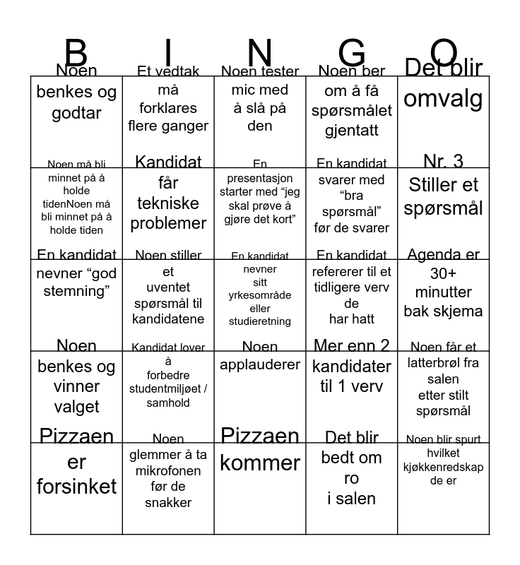 This bingo card has 31 words: Pizzaen kommer, Noen spør om hva som gjør dem egnet til vervet, Noen stiller et uventet spørsmål til kandidatene, Agenda er 15+ minutter før skjema, Noen benkes og godtar, Noen tester mic med å slå på den, Kandidat får tekniske problemer, Mer enn 2 kandidater til 1 verv, En kandidat refererer til et tidligere verv de har hatt, Det blir bedt om ro i salen, Agenda er 30+ minutter bak skjema, En kandidat nevner sitt yrkesområde eller studieretning, Noen blir spurt hvilket kjøkkenredskap de er, “Stem på meg”, Nr. 3 Stiller et spørsmål, Noen takker for alle deltakerne, Noen får et latterbrøl fra salen etter stilt spørsmål, Kandidat lover å forbedre studentmiljøet / samhold, Noen benkes og vinner valget, Noen applauderer, Det blir omvalg, Mer enn 5 kandidater til 1 verv, Pizzaen er forsinket, Et vedtak må forklares flere ganger, En kandidat svarer med “bra spørsmål” før de svarer, Noen må bli minnet på å holde tidenNoen må bli minnet på å holde tiden, Noen ber om å få spørsmålet gjentatt, En kandidat nevner “god stemning”, Noen glemmer å ta mikrofonen før de snakker, En presentasjon starter med “jeg skal prøve å gjøre det kort” and Noen kommer for sent og må snike seg inn.