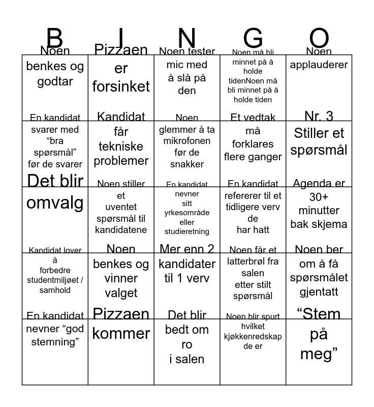 This bingo card has 30 words: Pizzaen kommer, Noen spør om hva som gjør dem egnet til vervet, Noen stiller et uventet spørsmål til kandidatene, Agenda er 15+ minutter før skjema, Noen benkes og godtar, Noen tester mic med å slå på den, Kandidat får tekniske problemer, Mer enn 2 kandidater til 1 verv, En kandidat refererer til et tidligere verv de har hatt, Det blir bedt om ro i salen, Agenda er 30+ minutter bak skjema, En kandidat nevner sitt yrkesområde eller studieretning, Noen blir spurt hvilket kjøkkenredskap de er, “Stem på meg”, Nr. 3 Stiller et spørsmål, Noen takker for alle deltakerne, Noen får et latterbrøl fra salen etter stilt spørsmål, Kandidat lover å forbedre studentmiljøet / samhold, Noen benkes og vinner valget, Noen applauderer, Det blir omvalg, Mer enn 5 kandidater til 1 verv, Pizzaen er forsinket, Et vedtak må forklares flere ganger, En kandidat svarer med “bra spørsmål” før de svarer, Noen må bli minnet på å holde tidenNoen må bli minnet på å holde tiden, Noen ber om å få spørsmålet gjentatt, En kandidat nevner “god stemning”, Noen glemmer å ta mikrofonen før de snakker and En presentasjon starter med “jeg skal prøve å gjøre det kort”.