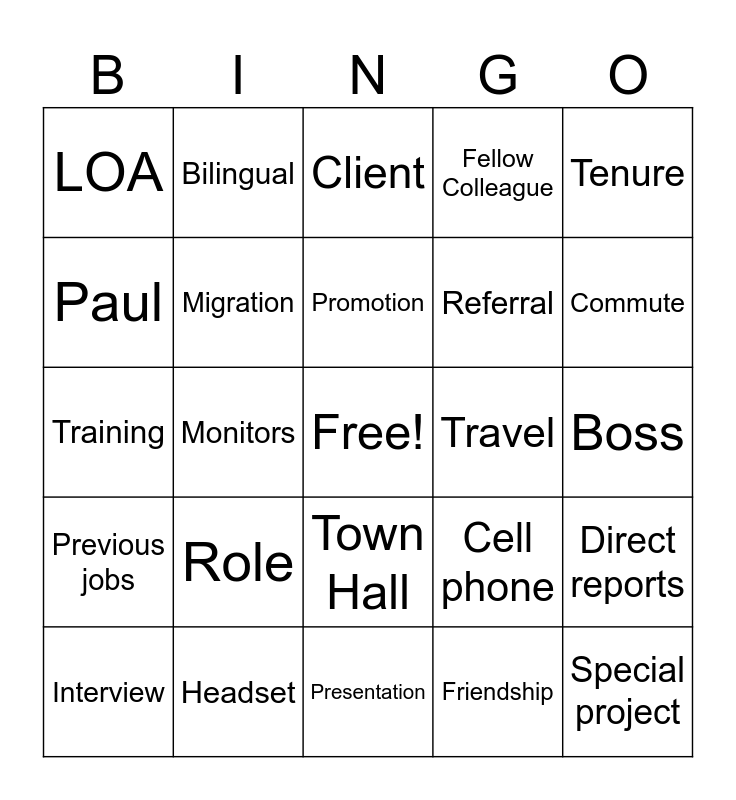 This bingo card has a free space and 24 words: Role, Headset, Promotion, Interview, Tenure, LOA, Paul, Bilingual, Travel, Town Hall, Referral, Training, Cell phone, Direct reports, Migration, Friendship, Boss, Client, Commute, Monitors, Special project, Previous jobs, Fellow Colleague and Presentation.