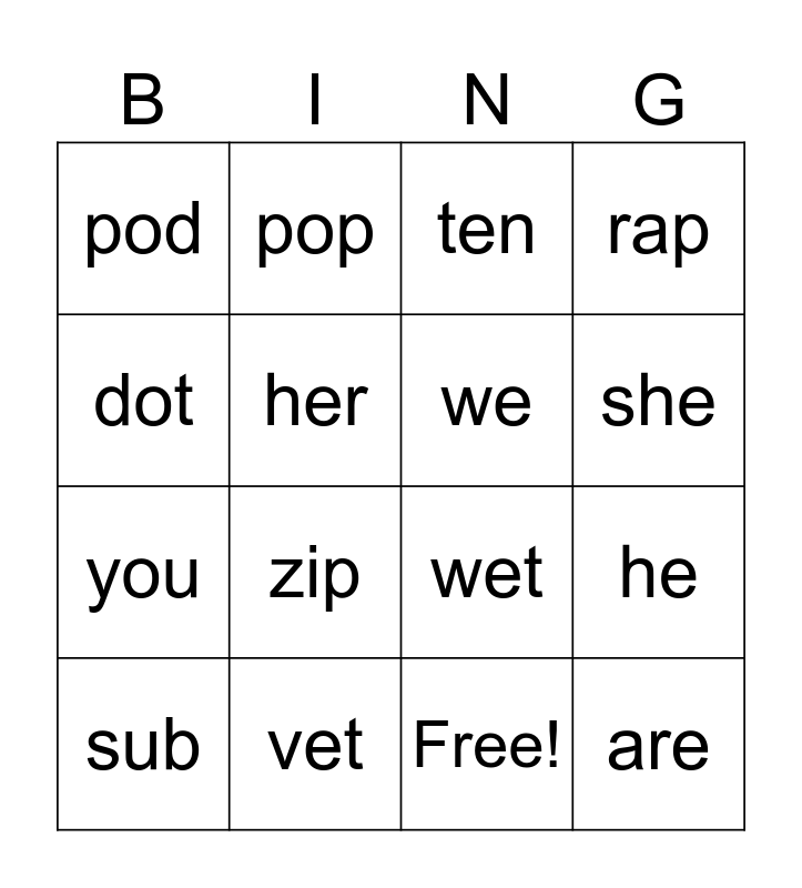 This bingo card has 17 words: Free!, sub, ten, pod, zip, rap, he, we, she, her, vet, wet, dot, pop, you, with and are.