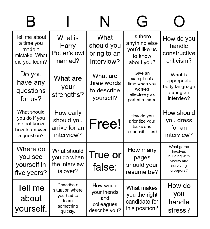 This bingo card has a free space and 29 words: Tell me about yourself., What are your weaknesses?, How early should you arrive for an interview?, Why are you interested in this position?, Tell me about a time you made a mistake. What did you learn?, What should you bring to an interview?, What are your strengths?, What should you do when the interview is over?, How do you prioritize your tasks and responsibilities?, Describe a situation where you had to learn something quickly., How should you dress for an interview?, How do you handle stress?, How would your friends and colleagues describe you?, What makes you the right candidate for this position?, What is appropriate body language during an interview?, How do you stay organize?, True or false:, Where do you see yourself in five years?, How do you handle constructive criticism?, What should you do if you do not know how to answer a question?, How many pages should your resume be?, Talk about a time that you overcame a challenge., Give an example of a time when you worked effectively as part of a team., Do you have any questions for us?, Is there anything else you’d like us to know about you?, What is Harry Potter's owl named?, What game involves building with blocks and surviving creepers?, What are three words to describe yourself? and Should you have your phone out during an interview?.