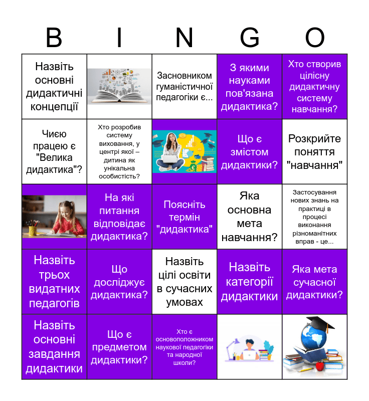 This bingo card has 5 images, a free space and 19 words: Що досліджує дидактика?, Що є предметом дидактики?, Назвіть основні завдання дидактики, Хто створив цілісну дидактичну систему навчання?, Назвіть основні дидактичні концепції, Чиєю працею є "Велика дидактика"?, Яка основна мета навчання?, Назвіть цілі освіти в сучасних умовах, Що є змістом дидактики?, Назвіть категорії дидактики, Яка мета сучасної дидактики?, Хто розробив систему виховання, у центрі якої – дитина як унікальна особистість?, Застосування нових знань на практиці в процесі виконання різноманітних вправ - це..., Засновником гуманістичної педагогіки є..., Розкрийте поняття "навчання", На які питання відповідає дидактика?, Назвіть трьох видатних педагогів, З якими науками пов'язана дидактика? and Хто є основоположником наукової педагогіки та народної школи?.