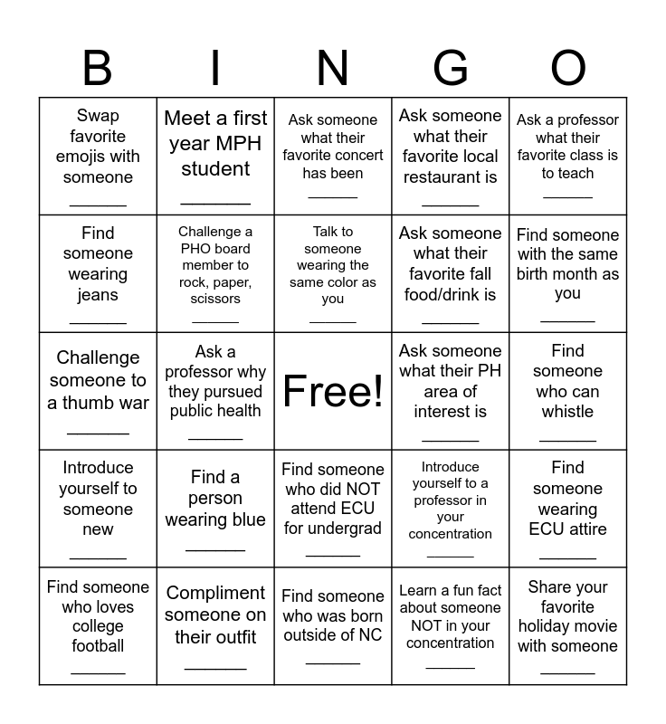 This bingo card has a free space and 24 words: Find a person wearing blue ______, Compliment someone on their outfit ______, Talk to someone wearing the same color as you ______, Find someone who loves college football ______, Ask a professor what their favorite class is to teach ______, Swap favorite emojis with someone ______, Find someone wearing jeans ______, Meet a first year MPH student ______, Ask someone what their PH area of interest is ______, Find someone who did NOT attend ECU for undergrad ______, Ask someone what their favorite fall food/drink is ______, Challenge someone to a thumb war ______, Introduce yourself to a professor in your concentration ______, Find someone wearing ECU attire ______, Challenge a PHO board member to rock, paper, scissors ______, Learn a fun fact about someone NOT in your concentration ______, Find someone who can whistle ______, Ask someone what their favorite concert has been ______, Find someone with the same birth month as you ______, Ask a professor why they pursued public health ______, Share your favorite holiday movie with someone ______, Introduce yourself to someone new ______, Ask someone what their favorite local restaurant is ______ and Find someone who was born outside of NC ______.