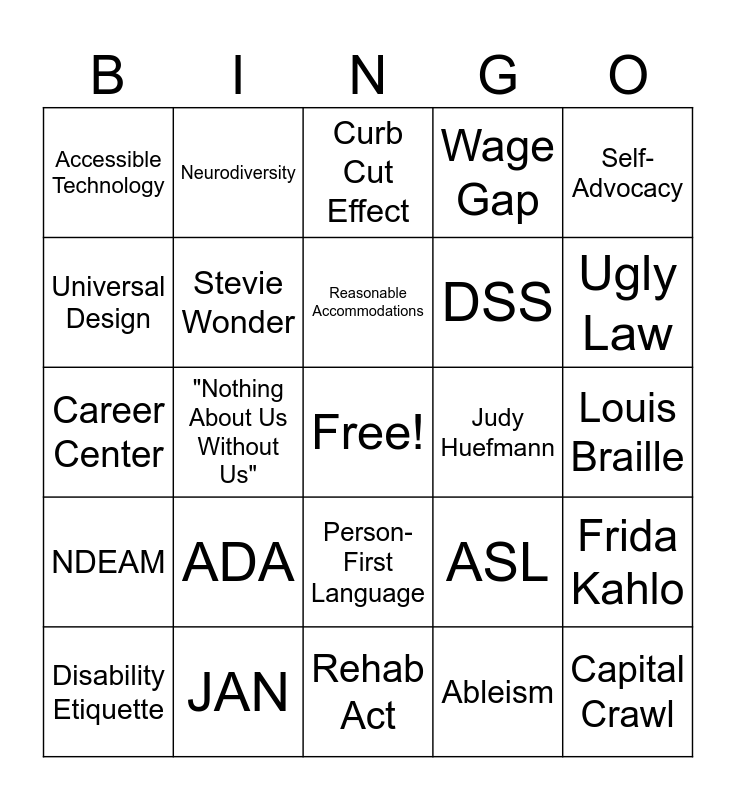 This bingo card has a free space and 24 words: ADA, JAN, Reasonable Accommodations, Disability Etiquette, Self-Advocacy, Accessible Technology, Universal Design, Neurodiversity, Judy Huefmann, Person-First Language, DSS, Career Center, ASL, Frida Kahlo, Stevie Wonder, Ableism, Louis Braille, Curb Cut Effect, Ugly Law, "Nothing About Us Without Us", Capital Crawl, NDEAM, Wage Gap and Rehab Act.