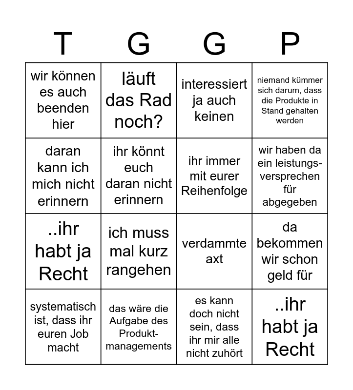 This bingo card has 17 words: es kann doch nicht sein, dass ihr mir alle nicht zuhört, systematisch ist, dass ihr euren Job macht, interessiert ja auch keinen, wir können es auch beenden hier, ich muss mal kurz rangehen, niemand kümmer sich darum, dass die Produkte in Stand gehalten werden, da bekommen wir schon geld für, ihr immer mit eurer Reihenfolge, wir haben da ein leistungs-versprechen für abgegeben, ihr könnt euch daran nicht erinnern, das wäre die Aufgabe des Produkt-managements, verdammte axt, daran kann ich mich nicht erinnern, läuft das Rad noch?, ..ihr habt ja Recht, Thomas wir brauchen deine Aufmerksamkeit and ..ihr habt ja Recht.
