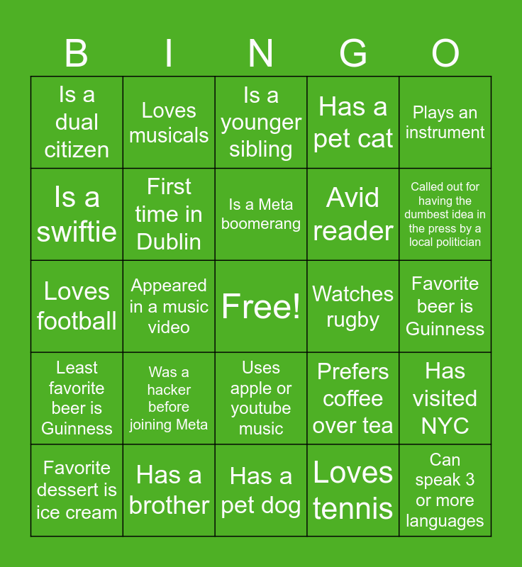 This bingo card has a free space and 29 words: Favorite dessert is ice cream, Is a virgo, Appeared in a music video, Went to the oasis concert, Is a dual citizen, Is a younger sibling, First time in Dublin, Was a hacker before joining Meta, Watches rugby, Has a brother, Favorite beer is Guinness, Can speak 3 or more languages, Has a pet dog, Loves tennis, Called out for having the dumbest idea in the press by a local politician, Favorite season is summer, Uses apple or youtube music, Least favorite beer is Guinness, Plays an instrument, Loves football, Prefers coffee over tea, Has an older sister, Avid reader, Is a swiftie, Has a pet cat, Loves musicals, Has visited NYC, Is a Meta boomerang and Favorite food is pasta.