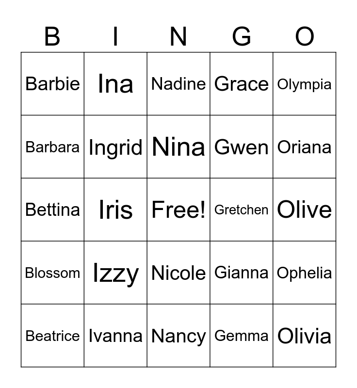 This bingo card has a free space and 39 words: Bianca, Ivy, Nara, Gianna, Ophelia, Blossom, Iris, Nathalie, Gretchen, Olive, Barbara, Ina, Gabriella, Oriana, Bettina, Izzy, Nicole, Grace, Oakley, Beatrice, Ingrid, Nina, Gemma, Olympia, Brittany, Ivanna, Nancy, Gloria, Orchid, Barbie, Isabella, Natasha, Gwen, Olivia, Beverly, Irene, Nadine, Georgina and Ocean.