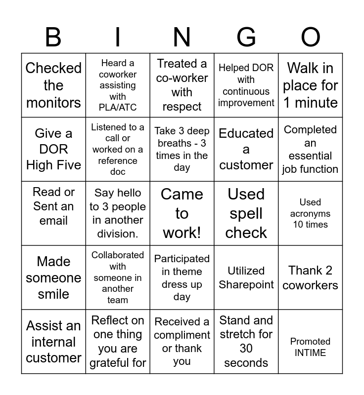 This bingo card has a free space and 24 words: Collaborated with someone in another team, Reflect on one thing you are grateful for, Take 3 deep breaths - 3 times in the day, Assist an internal customer, Walk in place for 1 minute, Checked the monitors, Give a DOR High Five, Heard a coworker assisting with PLA/ATC, Used spell check, Participated in theme dress up day, Educated a customer, Read or Sent an email, Utilized Sharepoint, Thank 2 coworkers, Listened to a call or worked on a reference doc, Stand and stretch for 30 seconds, Used acronyms 10 times, Treated a co-worker with respect, Completed an essential job function, Say hello to 3 people in another division., Promoted INTIME, Made someone smile, Helped DOR with continuous improvement and Received a compliment or thank you.