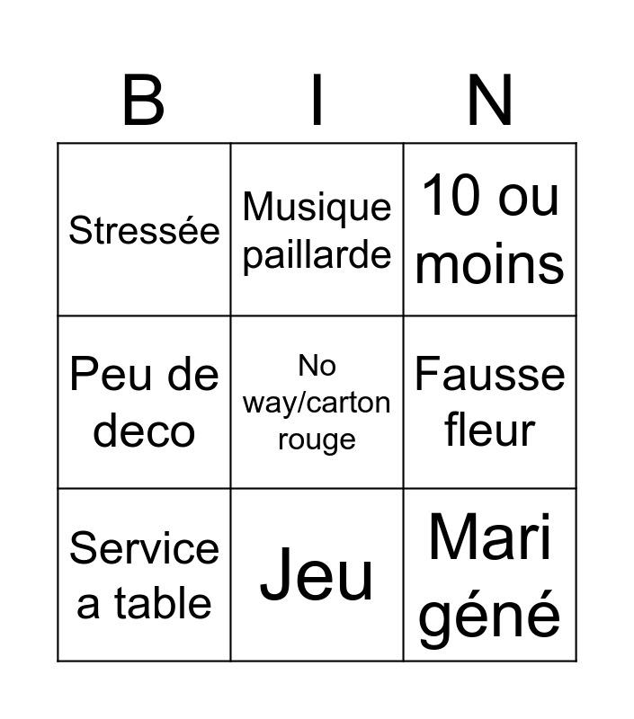This bingo card has a free space and 8 words: Fausse fleur, 10 ou moins, Musique paillarde, Service a table, Stressée, Mari géné, Peu de deco and Jeu.