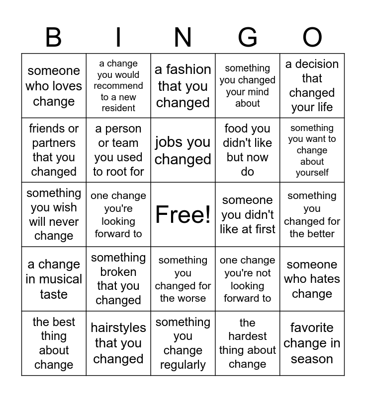 This bingo card has a free space and 24 words: something broken that you changed, hairstyles that you changed, jobs you changed, the best thing about change, a decision that changed your life, someone who loves change, friends or partners that you changed, a change you would recommend to a new resident, someone you didn't like at first, something you changed for the worse, food you didn't like but now do, something you wish will never change, one change you're not looking forward to, someone who hates change, a person or team you used to root for, the hardest thing about change, something you changed for the better, a fashion that you changed, something you want to change about yourself, one change you're looking forward to, favorite change in season, a change in musical taste, something you changed your mind about and something you change regularly.