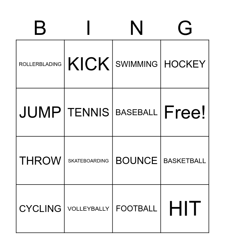 This bingo card has 17 words: FOOTBALL, CYCLING, SWIMMING, ROLLERBLADING, SKATEBOARDING, HOCKEY, BASKETBALL, BASEBALL, Free!, TENNIS, VOLLEYBALLY, BOUNCE, JUMP, KICK, THROW, CATCH and HIT.