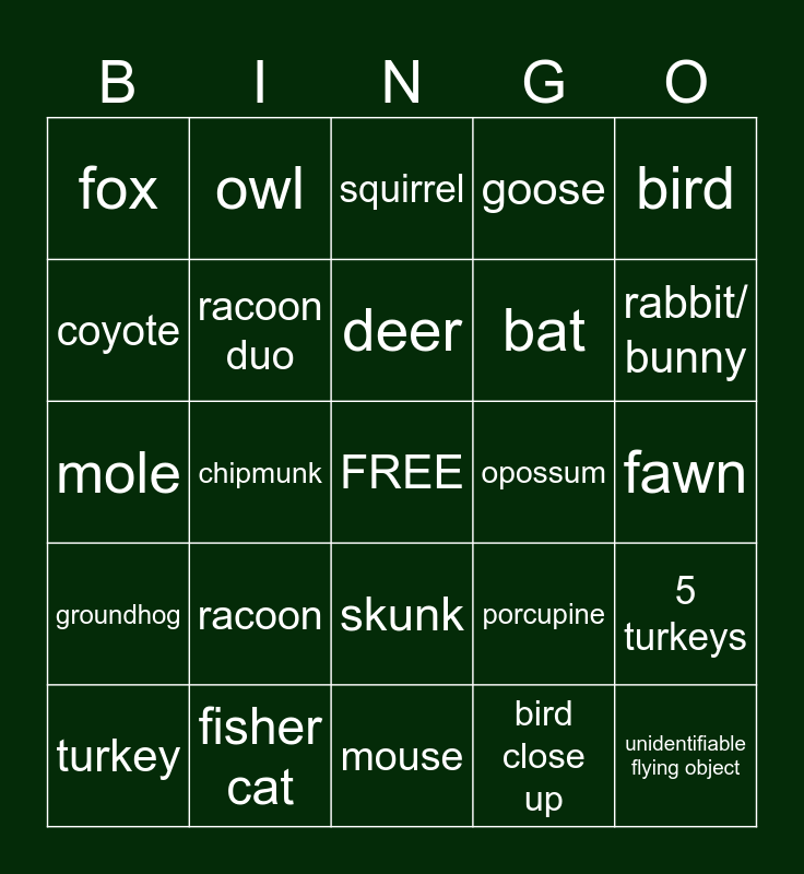 This bingo card has a free space and 24 words: racoon, fisher cat, deer, turkey, bird, fox, coyote, owl, opossum, skunk, bat, mole, porcupine, 5 turkeys, racoon duo, bird close up, fawn, squirrel, rabbit/ bunny, chipmunk, unidentifiable flying object, groundhog, goose and mouse.