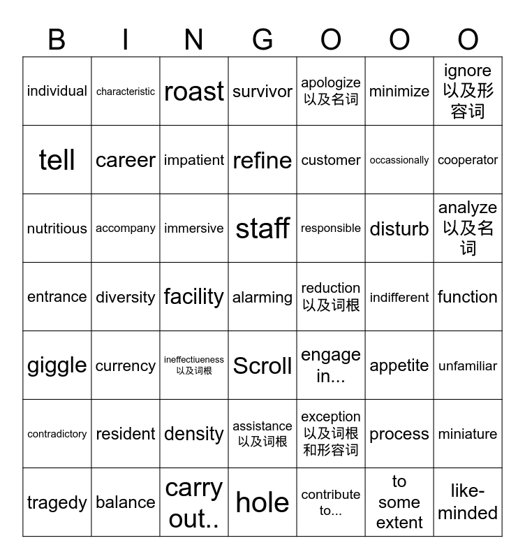 This bingo card has 70 words: account, nutritious, serve as., appetite, entrance, inspection, survivor, tragedy, apologize 以及名词, knock into.., disturb, hole, individual, roast, balcony, customer, staff, career, balance, accompany, cooperator, responsible, impatient, indifferent, currency, exception 以及词根和形容词, resident, assistance 以及词根, facility, miniature, characteristic, carry out.., attend to.., notification, engage in..., Scroll, contribute to..., occupied 以及词根, giggle, minimize, alarming, immersive, occassionally, complicated, form, ignore 以及形容词, analyze 以及名词, unfamiliar, quote, contradictory, process, stimulation, function, ineffectiueness 以及词根, diversity, relaxation 以及词根, tell, interruption, previously, reduction 以及词根, refine, mass, relevant, density, to some extent, resistance, mammal, like-minded, make the most of.. and muscle.