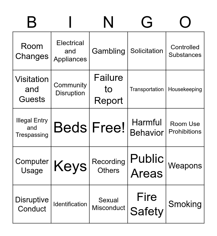 This bingo card has a free space and 33 words: Alcohol, Pets, Beds, Bicycles, Computer Usage, Community Disruption, Controlled Substances, Disruptive Conduct, Electrical and Appliances, Failure to Comply, Failure to Report, Gambling, Hall Sports, Hazing, Harmful Behavior, Housekeeping, Identification, Illegal Entry and Trespassing, Keys, Public Areas, Recording Others, Roommate Agreement, Room Changes, Room Use Prohibitions, Sexual Misconduct, Smoking, Solicitation, Transportation, Visitation and Guests, Weapons, Windows & Screens, Fire Safety and Vandalism & Theft.