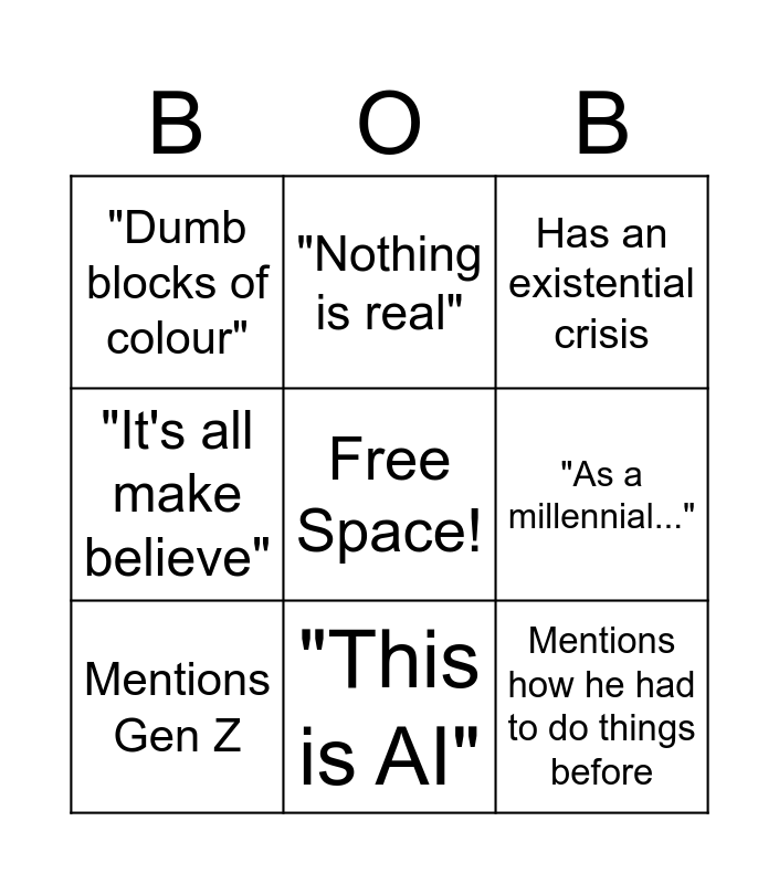 This bingo card has a free space and 8 words: "As a millennial...", Has an existential crisis, "Nothing is real", Mentions Gen Z, "Dumb blocks of colour", Mentions how he had to do things before, "It's all make believe" and "This is AI".