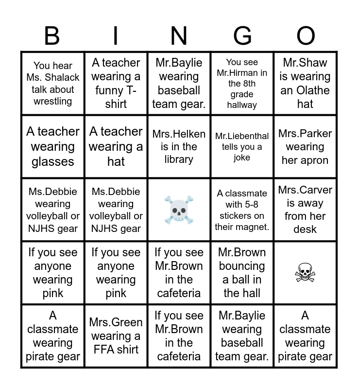 This bingo card has a free space and 49 words: Mrs.Parker wearing her apron, A classmate wearing pirate gear, Someone is reading a book you've read before, If you see Mr.Brown in the cafeteria, If you see anyone wearing pink, A classmate has mismatched socks, A teacher wearing a funny T-shirt, Mr.Piatt wearing black, A teacher wearing glasses, Mrs.Green wearing a FFA shirt, A teacher wearing a hat, You see Mr.Hirman in the 8th grade hallway, ☠, Mr.Brown bouncing a ball in the hall, Mrs.Carver is away from her desk, Mr.Motley is drawing something, Mrs.Helken is in the library, A classmate with 5-8 stickers on their magnet., Mrs.Hancock in the hallway, Mr.Shaw is wearing an Olathe hat, Ms.Debbie wearing volleyball or NJHS gear, Mr.Baylie wearing baseball team gear., You hear Ms. Shalack talk about wrestling, Mr.Liebenthal tells you a joke, You see Sgt. Gus in the school., Mrs.Parker wearing her apron, A classmate wearing pirate gear, Someone is reading a book you've read before, If you see Mr.Brown in the cafeteria, If you see anyone wearing pink, A classmate has mismatched socks, A teacher wearing a funny T-shirt, Mr.Piatt wearing black, A teacher wearing glasses, Mrs.Green wearing a FFA shirt, A teacher wearing a hat, You see Mr.Hirman in the 8th grade hallway, Mr.Brown bouncing a ball in the hall, Mrs.Carver is away from her desk, Mr.Motley is drawing something, Mrs.Helken is in the library, A classmate with 5-8 stickers on their magnet., Mrs.Hancock in the hallway, Mr.Shaw is wearing an Olathe hat, Ms.Debbie wearing volleyball or NJHS gear, Mr.Baylie wearing baseball team gear., You hear Ms. Shalack talk about wrestling, Mr.Liebenthal tells you a joke and You see Sgt. Gus in the school..