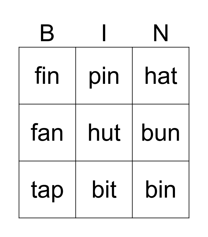 This bingo card has 12 words: pup, bin, hut, bun, pin, hat, bit, fun, fin, fan, tap and map.