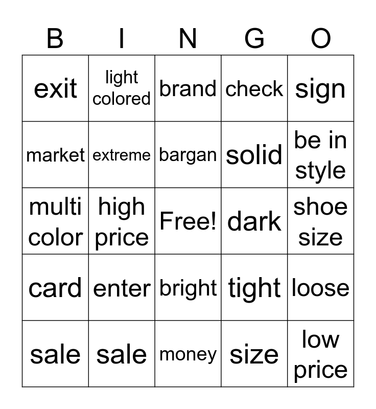 This bingo card has a free space and 24 words: enter, sale, bargan, sale, sign, exit, market, light colored, dark, bright, solid, multi color, tight, loose, extreme, size, shoe size, brand, be in style, high price, low price, card, check and money.