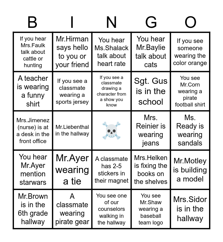 This bingo card has a free space and 24 words: Mr.Ayer wearing a tie, A classmate wearing pirate gear, If you see a classmate drawing a character from a show you know, Mr.Brown is in the 6th grade hallway, If you see someone wearing the color orange, If you hear Mrs.Faulk talk about cattle or hunting, A teacher is wearing a funny shirt, Mr.Hirman says hello to you or your friend, Mrs. Reinier is wearing jeans, A classmate has 2-5 stickers in their magnet, Sgt. Gus is in the school, Mrs.Jimenez (nurse) is at a desk in the front office, Mrs.Helken is fixing the books on the shelves, Mr.Motley is building a model, If you see a classmate wearing a sports jersey, You see Mr.Shaw wearing a baseball team logo, Ms. Ready is wearing sandals, You hear Ms.Shalack talk about heart rate, You see Mr.Corn wearing a pirate football shirt, Mr.Liebenthal in the hallway, Mrs.Sidor is in the hallway, You hear Mr.Ayer mention starwars, You hear Mr.Baylie talk about cats and You see one of our counselors walking in the hallway.
