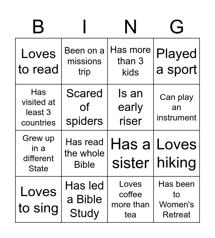 This bingo card has 16 words: Has led a Bible Study, Loves hiking, Has more than 3 kids, Loves to read, Grew up in a different State, Been on a missions trip, Has a sister, Loves coffee more than tea, Has visited at least 3 countries, Scared of spiders, Loves to sing, Played a sport, Has read the whole Bible, Can play an instrument, Is an early riser and Has been to Women's Retreat.