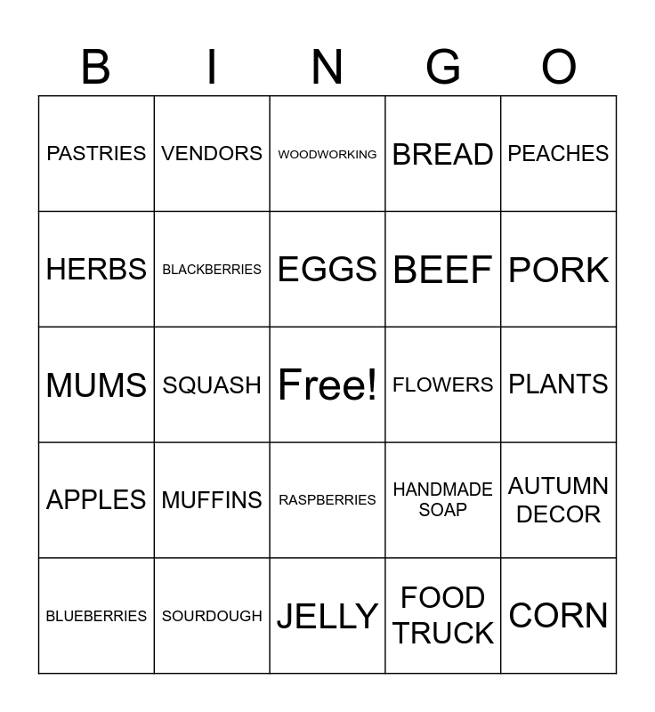 This bingo card has a free space and 39 words: TOMATOES, CARROTS, STRAWBERRIES, BLACKBERRIES, BLUEBERRIES, RASPBERRIES, EGGS, HONEY, PEACHES, APPLES, SQUASH, BREAD, CORN, PLANTS, FLOWERS, MUFFINS, COOKIES, PASTRIES, PUMPKINS, HANDMADE SOAP, HERBS, JELLY, BEEF, PORK, JEWELRY, CHEESE, POTATOES, PEPPERS, GREEN BEANS, VENDORS, PRODUCE, CUCUMBERS, WOODWORKING, SOURDOUGH, FOOD TRUCK, ENTERTAINMENT, AUTUMN DECOR, MUMS and ART.