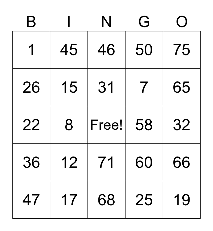 This bingo card has a free space and 24 words: 12, 17, 31, 47, 75, 1, 26, 45, 58, 71, 7, 22, 60, 66, 15, 25, 32, 46, 65, 8, 19, 36, 50 and 68.