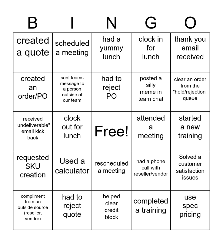 This bingo card has a free space and 24 words: Used a calculator, had to reject quote, had to reject PO, compliment from an outside source (reseller, vendor), thank you email received, created a quote, created an order/PO, scheduled a meeting, attended a meeting, rescheduled a meeting, posted a silly meme in team chat, received "undeliverable" email kick back, had a phone call with reseller/vendor, Solved a customer satisfaction issues, sent teams message to a person outside of our team, completed a training, started a new training, had a yummy lunch, clear an order from the "hold/rejection" queue, clock out for lunch, use spec pricing, requested SKU creation, clock in for lunch and helped clear credit block.