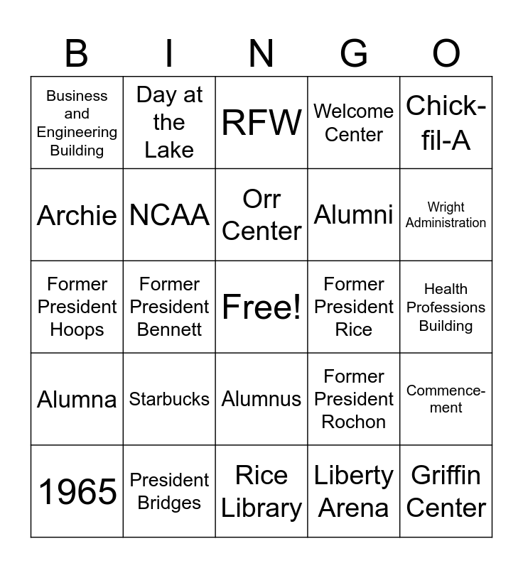 This bingo card has a free space and 24 words: Starbucks, President Bridges, Orr Center, 1965, Chick-fil-A, Business and Engineering Building, Archie, Day at the Lake, Former President Rice, Alumnus, Alumni, Former President Hoops, Former President Rochon, Commence- ment, NCAA, Liberty Arena, Health Professions Building, RFW, Wright Administration, Former President Bennett, Griffin Center, Alumna, Welcome Center and Rice Library.