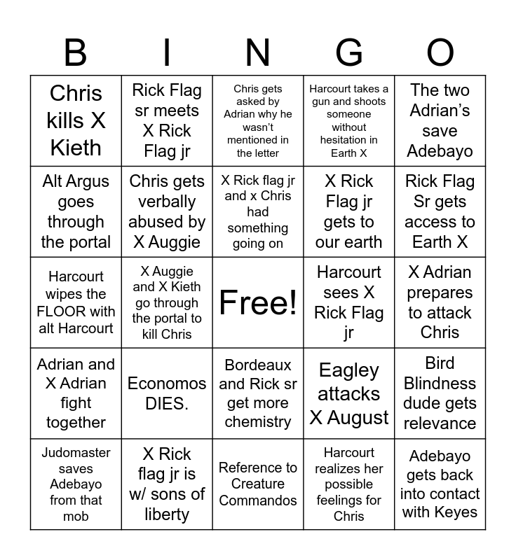This bingo card has a free space and 24 words: Economos DIES., X Rick flag jr is w/ sons of liberty, X Rick flag jr and x Chris had something going on, Judomaster saves Adebayo from that mob, The two Adrian’s save Adebayo, Chris kills X Kieth, Alt Argus goes through the portal, Rick Flag sr meets X Rick Flag jr, Harcourt sees X Rick Flag jr, Bordeaux and Rick sr get more chemistry, X Rick Flag jr gets to our earth, Harcourt wipes the FLOOR with alt Harcourt, Eagley attacks X August, Bird Blindness dude gets relevance, Chris gets verbally abused by X Auggie, Harcourt realizes her possible feelings for Chris, X Adrian prepares to attack Chris, Chris gets asked by Adrian why he wasn’t mentioned in the letter, Rick Flag Sr gets access to Earth X, X Auggie and X Kieth go through the portal to kill Chris, Adebayo gets back into contact with Keyes, Adrian and X Adrian fight together, Harcourt takes a gun and shoots someone without hesitation in Earth X and Reference to Creature Commandos.