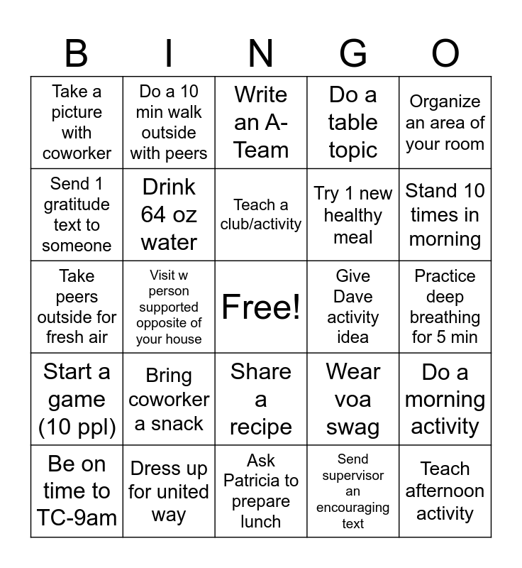 This bingo card has a free space and 24 words: Bring coworker a snack, Dress up for united way, Teach a club/activity, Be on time to TC-9am, Organize an area of your room, Take a picture with coworker, Send 1 gratitude text to someone, Do a 10 min walk outside with peers, Give Dave activity idea, Share a recipe, Try 1 new healthy meal, Take peers outside for fresh air, Wear voa swag, Do a morning activity, Drink 64 oz water, Send supervisor an encouraging text, Practice deep breathing for 5 min, Write an A-Team, Stand 10 times in morning, Visit w person supported opposite of your house, Teach afternoon activity, Start a game (10 ppl), Do a table topic and Ask Patricia to prepare lunch.