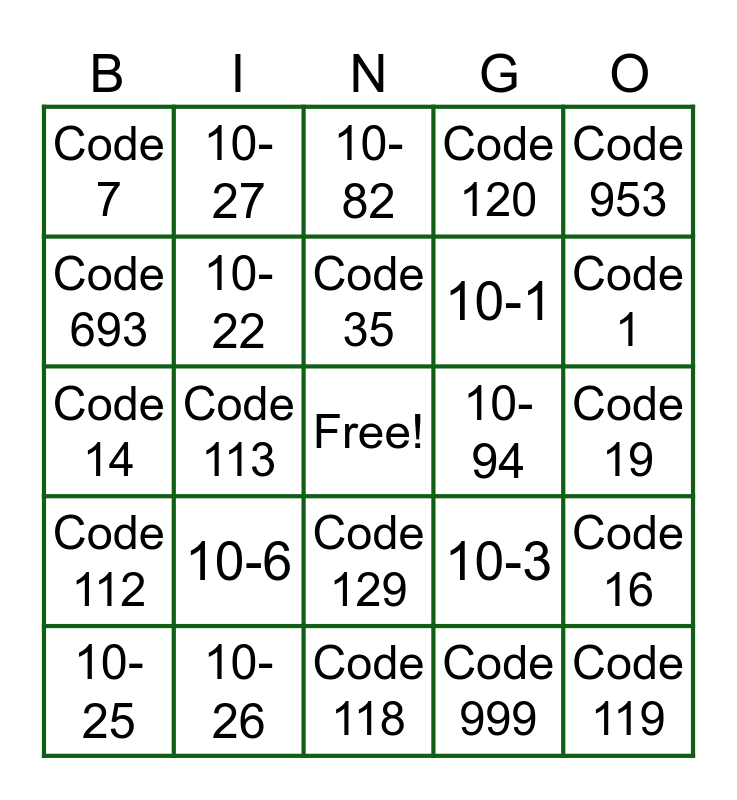 This bingo card has a free space and 133 words: Code 104, 10-91, 10-57, 10-58, 10-60, Code 101, Code 112, Code 115, Code 952, 10-0, Code 901, Code 103, 10-42, 10-59, Code 15, Code 12, 10-78, 10-29, 10-56, 10-55, Code 117, 10-26, Code 119, 10-5, 10-90, Code 111, Code 35, 10-98, 10-45, Code 110, 10-1, 10-27, Code 16, Code 1, Code 3, 10-50, Code 107, Code 900, Code 9, 10-41, Code 120, 10-9, 10-10, 10-20, 10-4, 10-30, 10-31, 10-35, 10-94, Code 953, 10-32, 10-19, Code 2, Code 951, Code 108, 10-100, 10-21, 10-28, 10-13, Code 113, Code 14, Code 4, Code 8, Code 5, 10-23, Code 121, 10-53, Code 109, 10-95, Code 693, Code 6, Code 129, Code 125, 10-17, 10-96, 10-43, Code 102, 10-24, Code 116, Code 122, Code 1401, 10-88, Code 998, Code 19, 10-64, Code 18, Code 20 Echo, Code 20, 10-52, 10-2, 10-22, 10-16, Code 10, Code 902, Code 118, Code 128, 10-8, Code 17, 10-46, 10-7, 10-51, 10-6, 10-82, 10-70, Code 309, 10-76, Code 926, 10-85, 10-18, Code 107a, Code 1103, 10-25, Code 181, Code 999, Code 1410, Code 950, 10-12, Code 7, Code 81, 10-3, Code 105, Code 11, 10-37, Code 123, Code 126, Code 106, Code 127, Code 114, 10-80, 10-14, Code 124, 10-89 and Code 1803.