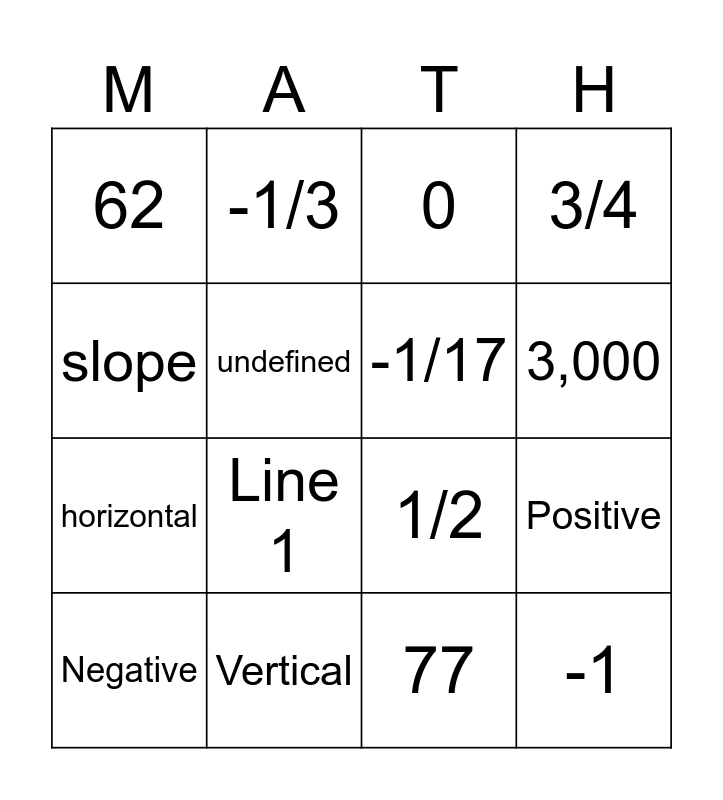 This bingo card has 28 words: 6, -3, horizontal, Free!, undefined, 0, -1/3, -1, Vertical, -3/2, 1/2, 3/4, -1, 5, Line 1, 2, -16, -1/17, 3,000, 100, 62, 1, Negative, Positive, 77, -9, slope and -10.