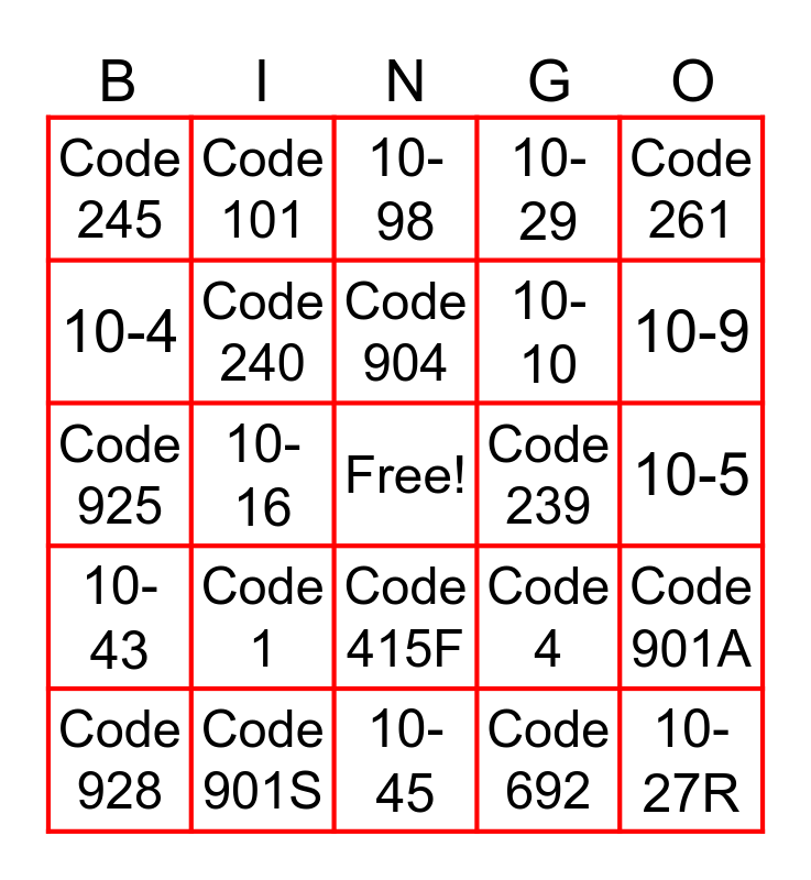 This bingo card has a free space and 92 words: 10-38M, Code 666, 10-45, 10-28, 10-27, 10-42, Code 901H, Code 928, 10-14, 10-3, Code 3, 10-7, Code 54A, 10-10, Code 20, Code 261, 10-98, 10-22, 10-20, 10-2, Code 964, Code 647, Code 200, Code 510, Code 1, Code 240, Code 11, Code 487, Code 5, 10-8, Code 901S, Code 415F, Code 917A, 10-15T, Code 101, 10-23, Code 2, 10-17, Code 904, Code 4, Code 925, 10-43, 10-5, 10-33, 10-27R, 10-97, Code 103, 10-38U, 10-6, Code 105, 10-19, 10-27S, Code 209, Code 102, Code 693, Code 906, Code 961, 10-4, Code 913, 10-16, 10-13, Code 998, 10-21, Code 7, Code 901C, Code 692, 10-35, Code 963, Code 34, 10-15, 10-38F, Code 999, 10-29, Code 420, 10-40, Code 647B, Code 901A, Code 555, Code 962, Code 459, Code 417, Code 239, Code 245, 10-46, Code 211, Code 77, Code 647A, 10-18, 10-1, Code 926, 10-9 and 10-52.