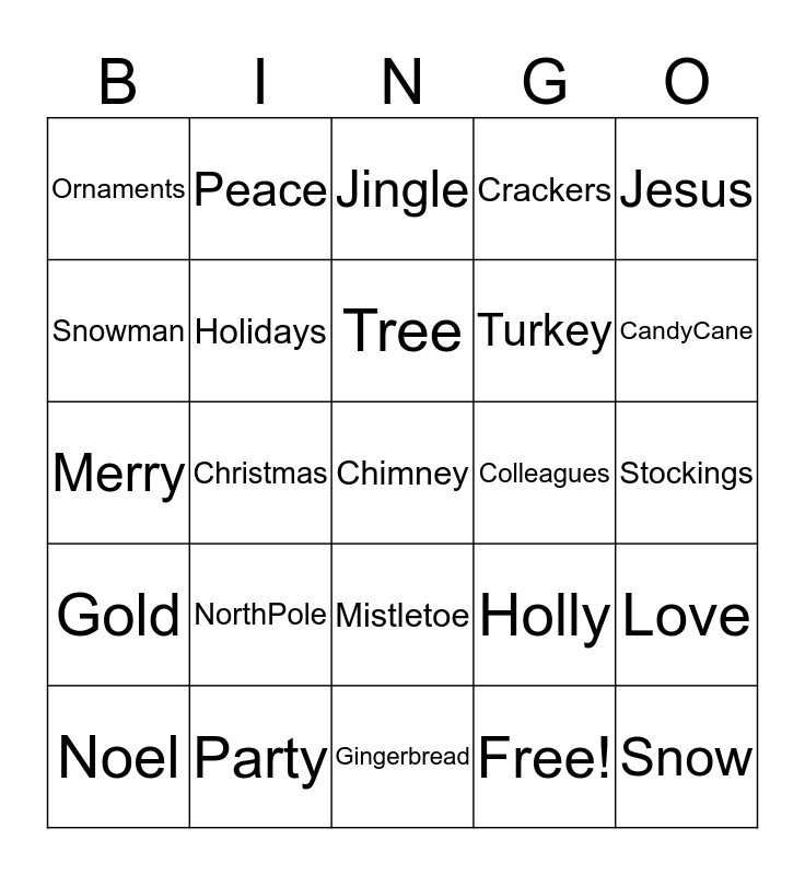 This bingo card has 32 words: Free!, Angels, Christmas, Gifts, Gold, Holidays, Jesus, Love, Peace, Snow, Tree, Jingle, Season, Festive, Colleagues, Carols, Noel, Merry, Mistletoe, NorthPole, Holly, Reindeer, Stockings, Party, Chimney, Crackers, Turkey, Snowman, Ornaments, Gingerbread, Elves and CandyCane.