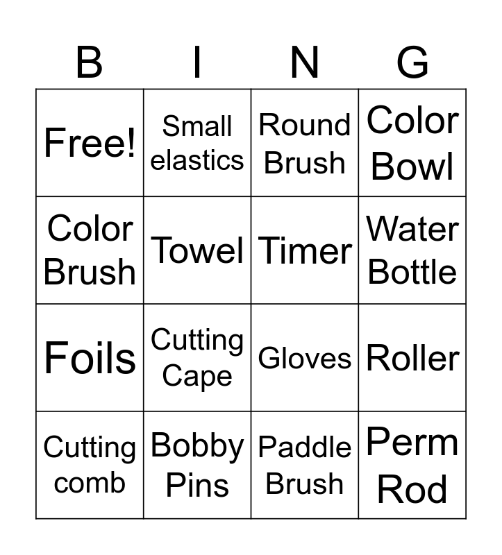 This bingo card has 16 words: Cutting comb, Bobby Pins, Round Brush, Color Bowl, Color Brush, Small elastics, Gloves, Roller, Free!, Towel, Paddle Brush, Water Bottle, Foils, Cutting Cape, Timer and Perm Rod.