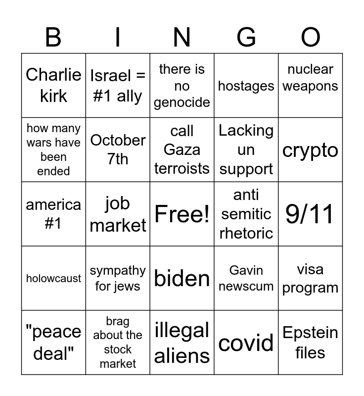 This bingo card has a free space and 24 words: sympathy for jews, brag about the stock market, call Gaza terroists, "peace deal", nuclear weapons, Charlie kirk, how many wars have been ended, Israel = #1 ally, anti semitic rhetoric, biden, Lacking un support, america #1, Gavin newscum, visa program, October 7th, covid, 9/11, there is no genocide, crypto, job market, Epstein files, holowcaust, hostages and illegal aliens.
